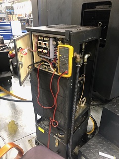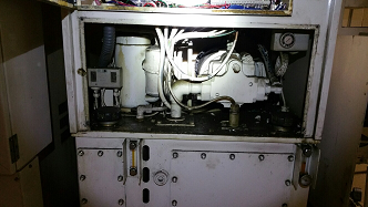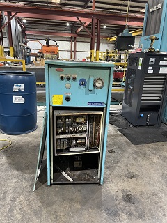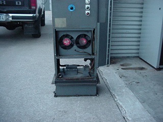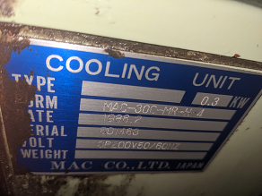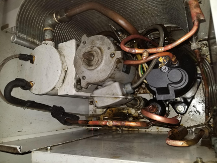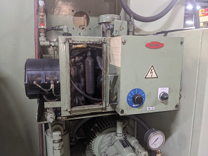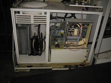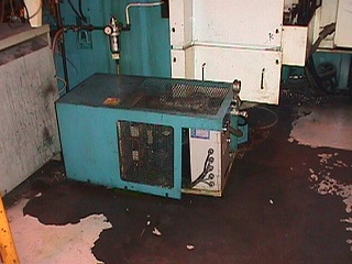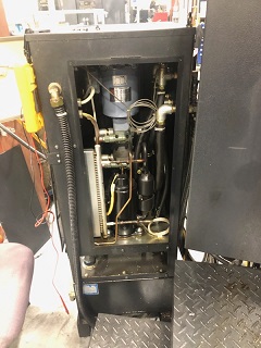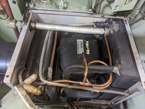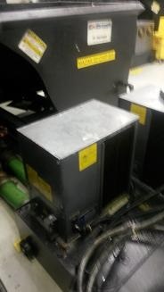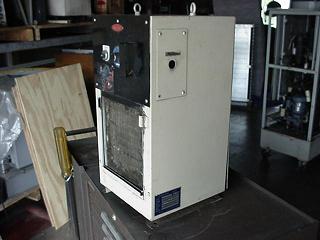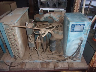 The evaporator section was leaking and of a custom design. Because the compressor is JAE 4400 Mitsubishi with performance so small and the shop was air conditioned, the HVAC contractor elected to install a shop-air blower over an after market copper coil radiator heat exchanger. The "oil chiller" was eliminated. |